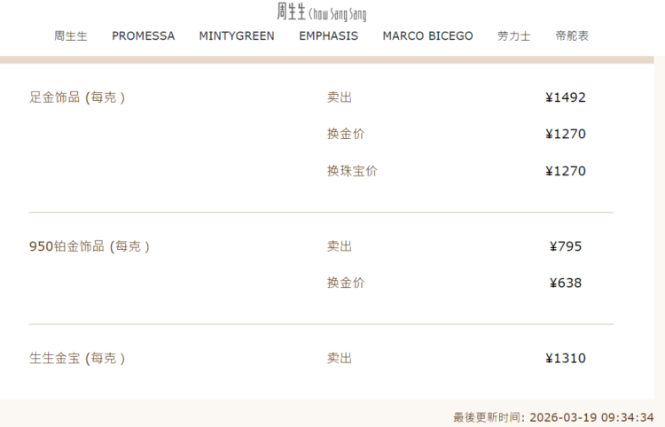 受此影响,国内金饰价格也大幅下跌。中新经纬19日查询发现,周生生金饰1492元/克,单日跌55元;相较3月3日月内高点跌158元。 老庙黄金金饰1507元/克,单日下跌43元,相较月内高点跌135元;老凤祥为1498元/克,单日跌42元,相较月内高点跌144元 。